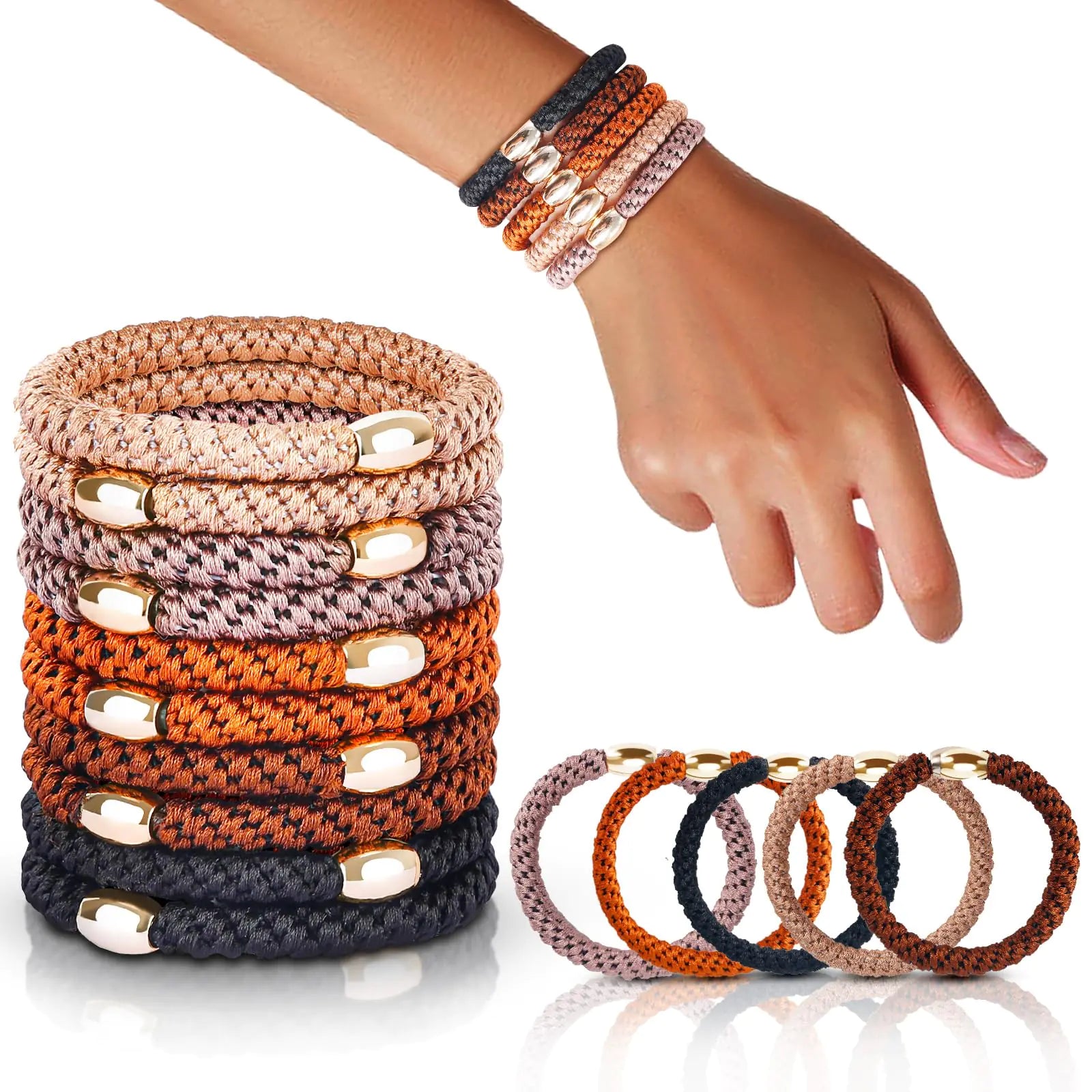 [【Say Goodbye to Easily Losing Elasticity】Our thick hair ties are 0.3 inches and stretch up to 9 inches.The super elasticity allows you to wrap it around your ponytail 2-3 times and the elastic hair ties stay in place all day without causing hair damage or loosening. "【Advanced Weaving Technology】Crafted using advanced weaving technology our braided hair ties wont break during daily use maintaining a neat hairstyle. From classic ponytails to intricate styles our hair ties provide the flexibility and hold you need for your desired look." 【Fashionable Ponytail Holders】Available in a set of 10 pony tails hair ties for women and girls with thick hair for daily use. Adorned with stylish gold decorative beads these bands add an elegant touch boosting your hair game with confidence. "【Daily Fashion Solution】Versatile hair ties suitable for thick straight curly hair and ponytails. Whether youre going for a casual or formal look our ponytail holders add the perfect finishing touch. Additionally wear them on your wrist as stylish bracelets keeping you trendy on the go." 【Ideal Hair Accessories for Women and Girls】Perfect for various occasions our thick hair ties offer a stylish solution for daily hairstyles during yoga studying running traveling dishwashing cooking working dating and other activities.]