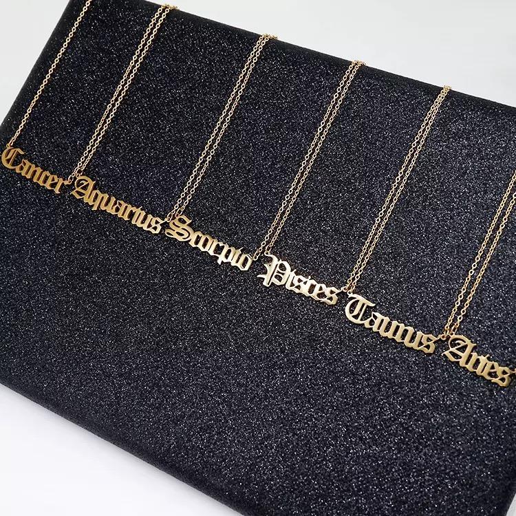 Now trending: zodiac names in an Olde English font. Each zodiac is beautifully lettered in a classy font, made with a dense, high-quality metal. Great to wear on its own or layer with any necklace in your collection!