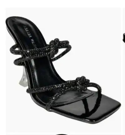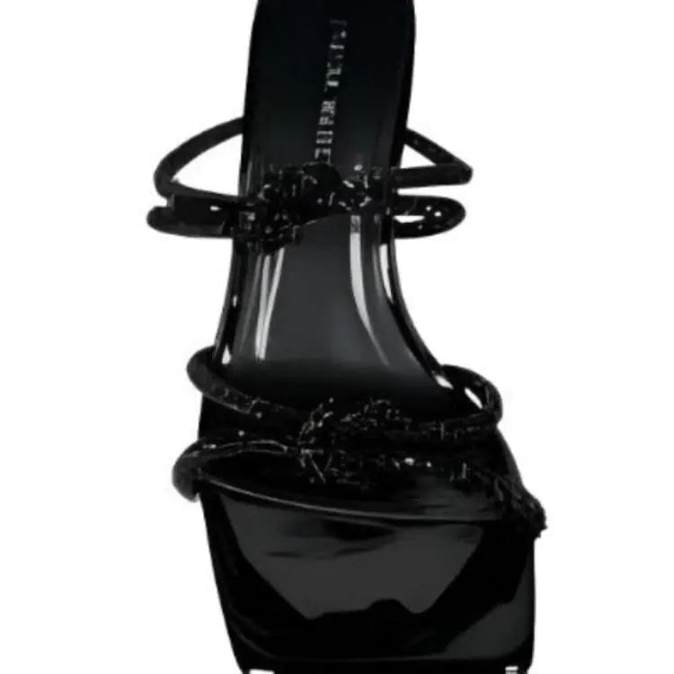 Sparkling crystals dazzle on the straps of a bold, glamorous sandal set on a lofty flared heel.